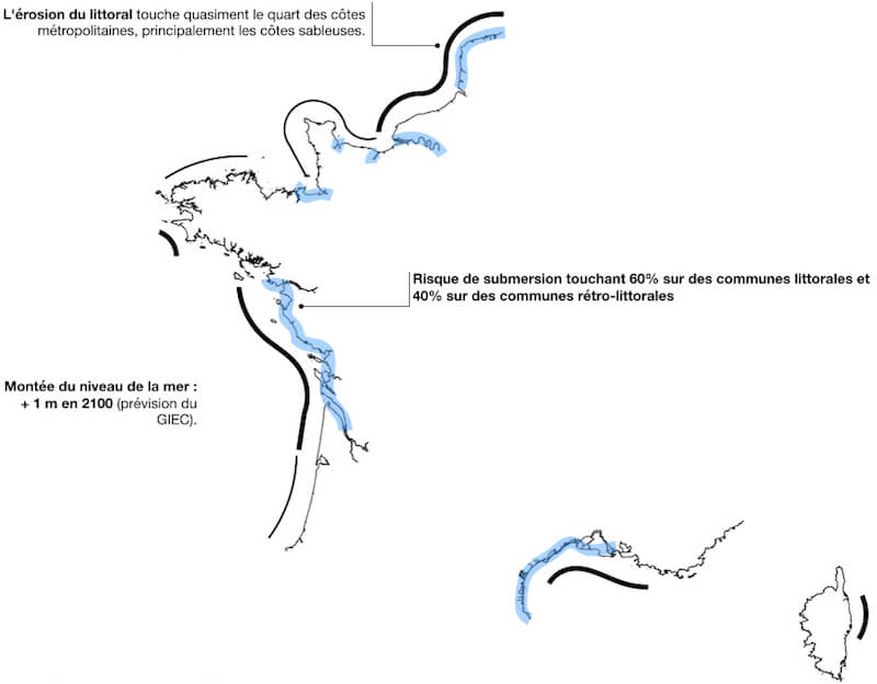 _ la destruction de bâtiment ou leur simple fragilisation par la submersion et les tempêtes pourrait entraîner à long terme un report de la construction sur des espaces rétro-littoraux aujourd’hui voués à l’agriculture avec des conflits d’usage et une restructuration des paysages ;